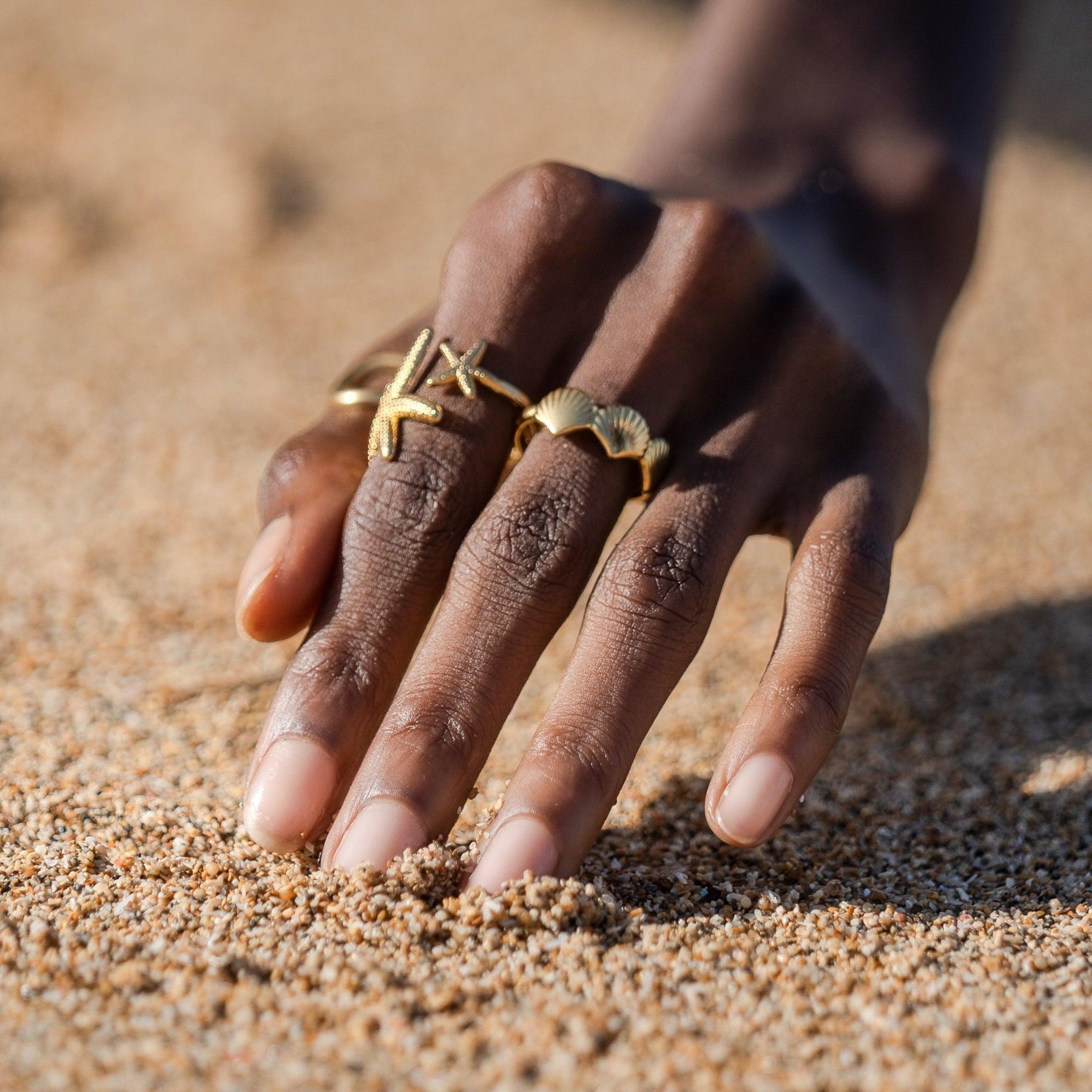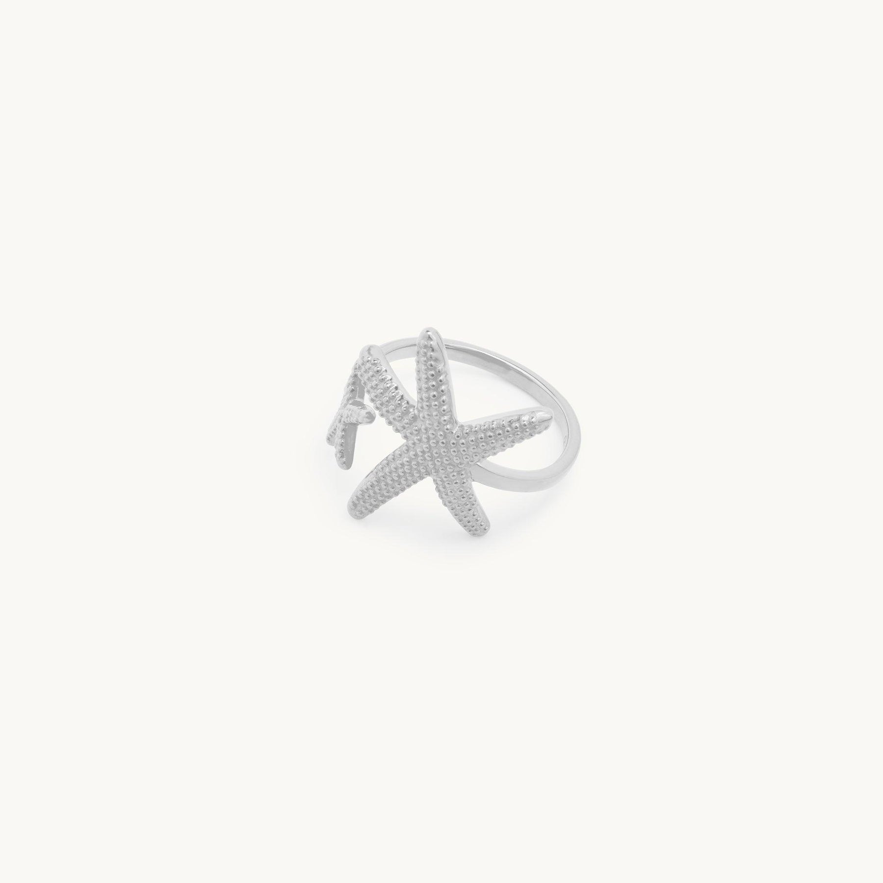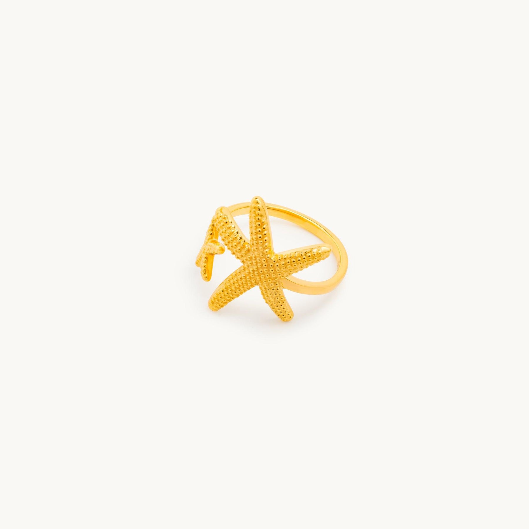 Inspirerad av havet, framställd för elegans. Denna rings lekfulla sjöstjärnedesign är den perfekta delen för ett raffinerat, fantasifullt grundplagg. Gjord av premiumgold och silverpläterad mässing, kan du bära havets charm (och glans) överallt du går.